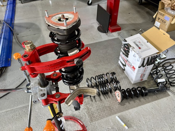 多分これが一番時間がかかると思われます。外れたら専用のスプリングコンプレッサーを使用してダウンサスへ交換していきます。