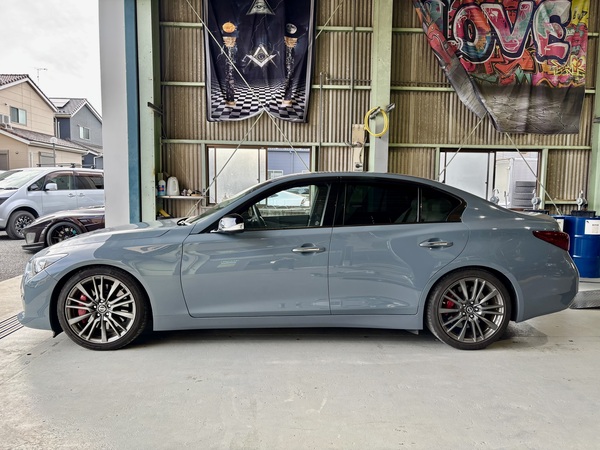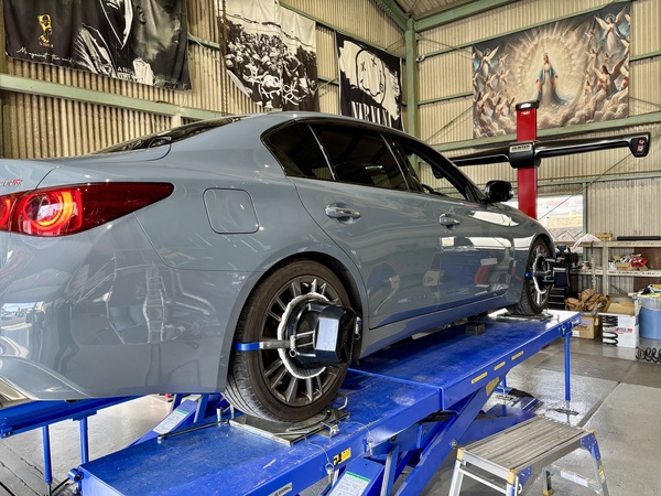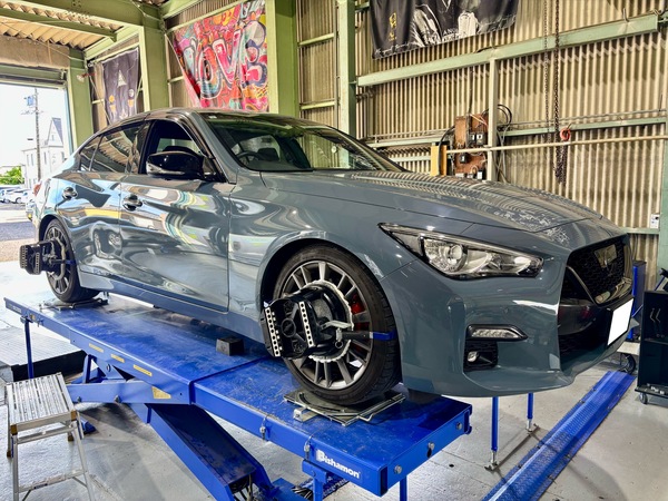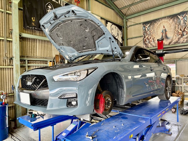 日産スカイラインHV37の足回り交換、ダウンサス交換、マフラー取り付け、4輪アライメント調整、車高調交換、タイヤ交換、スタッドレスタイヤ交換、タイヤは保管サービスことなら親切、丁寧な岐阜のフロンティアへお任せください!