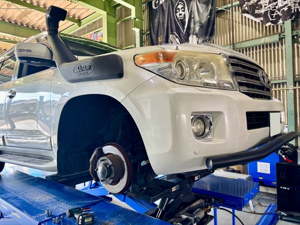トヨタ、ランクル200の足回り交換、ダウンサス交換、マフラー取り付け、4輪アライメント調整、車高調交換、タイヤ交換、スタッドレスタイヤ交換、タイヤは保管サービスことなら親切、丁寧な岐阜のフロンティアへお任せください!