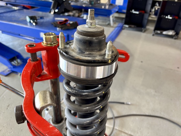 専用のスプリングコンプレッサーを使用してアッパーマウントを外していきます。