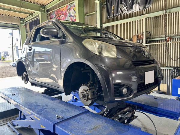 トヨタIQの足回り交換、ダウンサス交換、マフラー取り付け、4輪アライメント調整、車高調交換、タイヤ交換、スタッドレスタイヤ交換、タイヤは保管サービスことなら親切、丁寧な岐阜のフロンティアへお任せください!